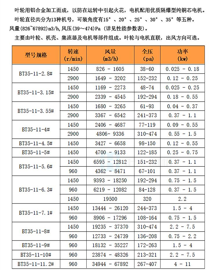 BT35-11系列防爆轴流风机为T35-11的派生产品,BT35-11圆通型轴流防爆吸风机、送风机其防爆标志为“Exd ⅡBT4 Gb”。即隔爆型IIB类电气设备,表面温度为T4组,设备保护级别“EPL Gb” ,具有“高”的保护级别,在正常运行或预期故障条件下不是点燃源。叶轮用铝合金加工而成,以防在运转中引起火花,电机配用隔爆型电机。叶轮直径共分为13种机号,可装角度有15°、20°、25°、30°、35°等五种。风量(826~67892)m3/h,风压(39~474)Pa (详见性能参数表)。主要由叶轮、机壳、集流器及电机等部件组成。叶轮与电机直联,转向为左旋(电机端看),也可按客户定制出风方向。