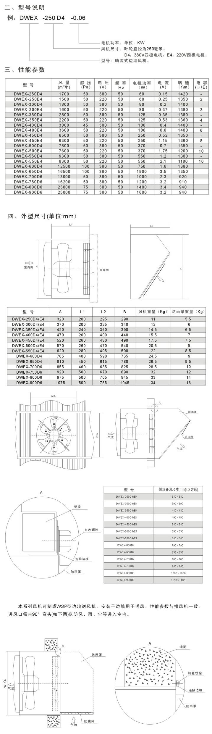 DWEX系列风机采用先进的前掠型叶片、低噪音的外转子或内转子风机用电机直联传动,方形外壳设计可以方便地安装在混凝土墙、砖墙或轻钢压型墙板上,方形防雨罩结构牢固,外形美观。具有噪声低、风量大、运行可靠、性能参数范围广、安装简便等特点,广泛应用于厂矿企业车间和民用、商用建筑工程的边墙壁式通风换气。根据输送介质的要求,可制成防腐、防爆型。
